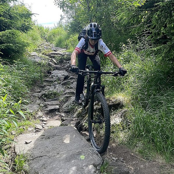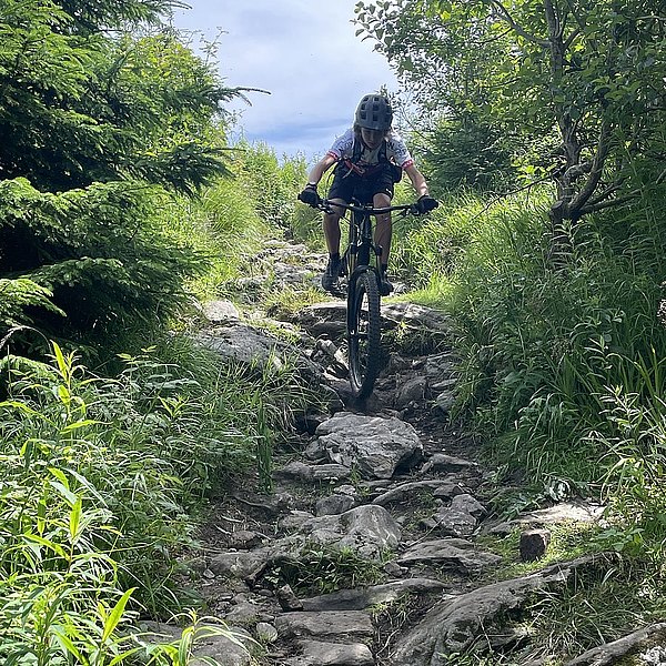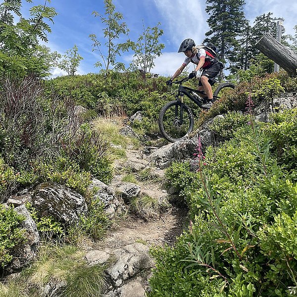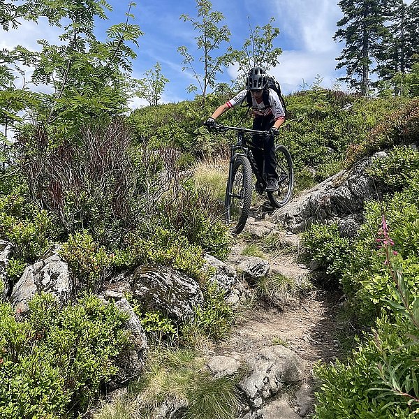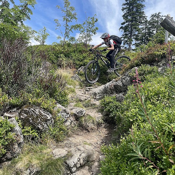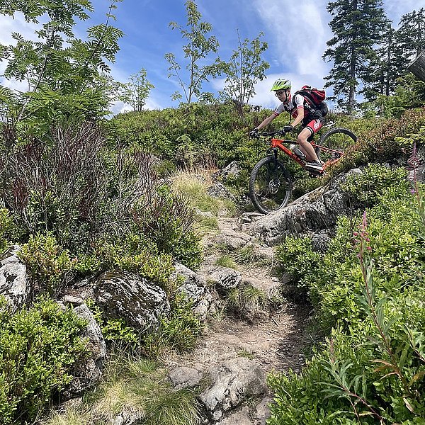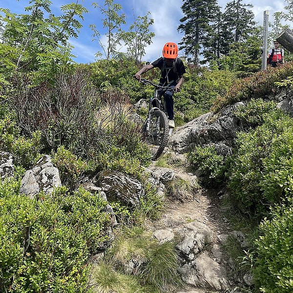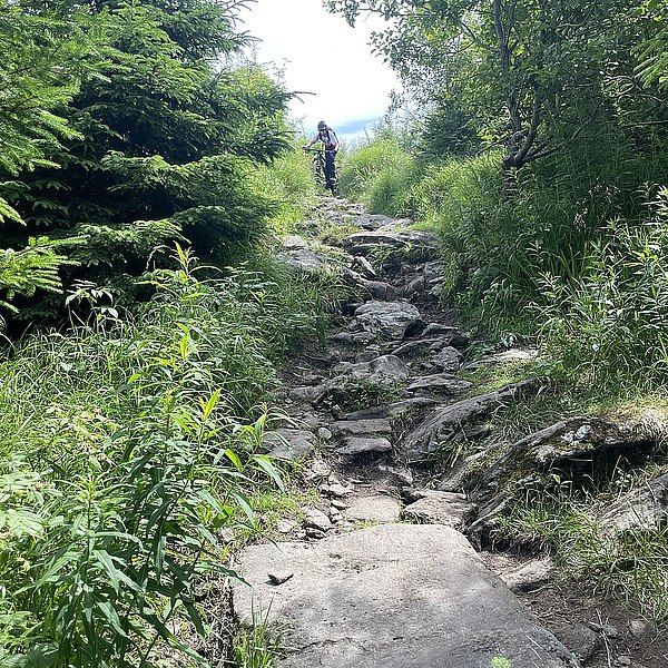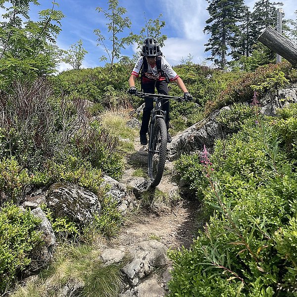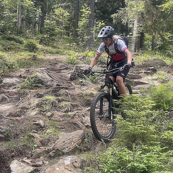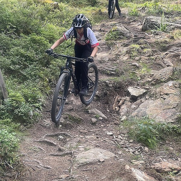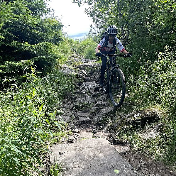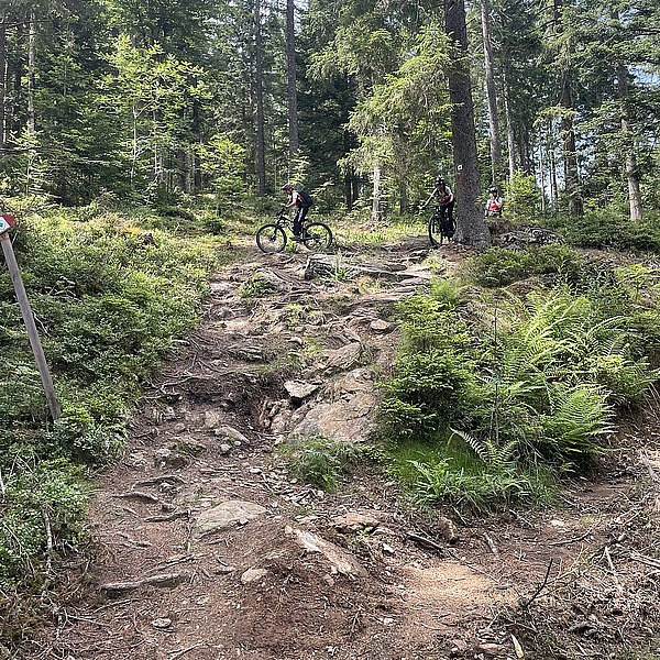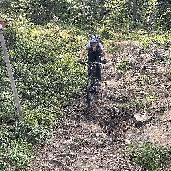 Der Trainer hatte eine spannende Abfahrt in Aussicht gestellt. Und die Erwartungen wurden nicht enttäuscht. Wurzeln, Steine, Stufen, Bachquerungen sowie schnelle Rollabschnitte wechselten sich ab. Es war keine Minute langweilig, Im Gegenteil: höchste Konzentration und aktives Arbeiten auf dem Bike waren notwendig, um die schwierigen Stellen zu meistern (Kategorie: S2-S3 auf der Singletrailskala).