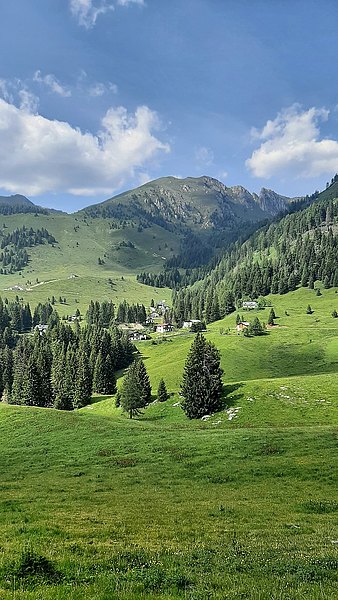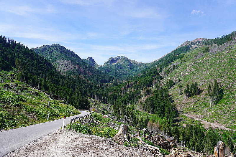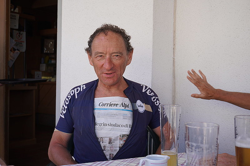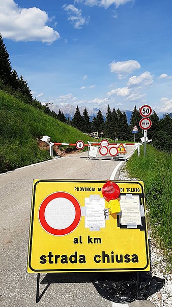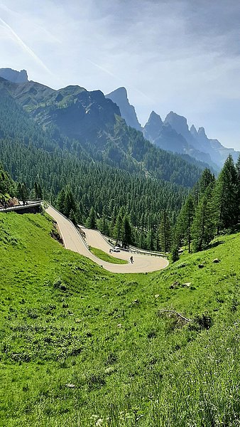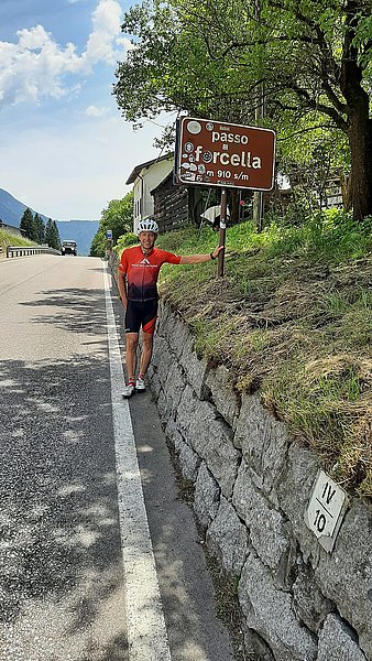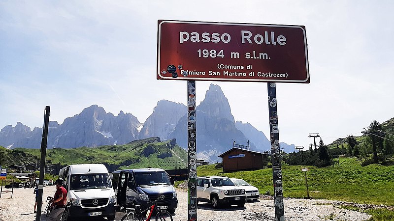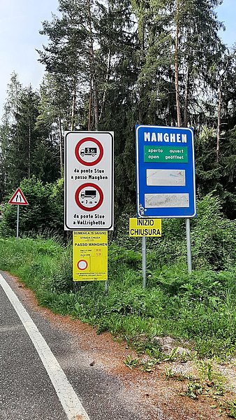 Von Cavalese nach Fiera di Primiero sollten wir so einiges erleben. Es ging zuerst auf den Passo Manghen, der für Fahrzeuge mit über 7 Meter Gesamtlänge gesperrt ist. Unser XXL Sprinter hatte laut Fahrzeugschein eine Länge von 6,99 Meter, also kein Problem. Oben auf der Passhöhe machten uns einige Motorradfahrer darauf aufmerksam, dass die Abfahrt auf der Südseite gesperrt sei. So entschieden wir uns die Busse zurück und auf anderem Wege in das heutige Etappenziel zu schicken und wir Radler setzten unsere geplante Strecke fort. In einer Kehre der Abfahrt sahen wir das Malheur, ein LKW der für den Radius der Kurve zu lang war und stecken blieb. Wir konnten in der Wiese passieren und weiter ging die Abfahrt. Nach dem Passo Forcella und oben auf dem Passo Broncon dann die nächste Blockade – strada chiusa -. Also umdrehen und auf demselben Weg wieder zurück um den letzten Pass des heutigen Tages zu umfahren und so zu unserem heutigen Ziel zu kommen.