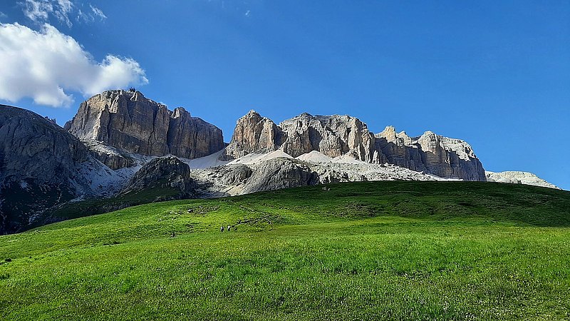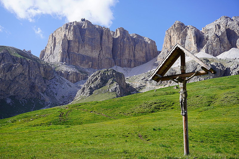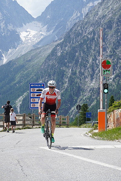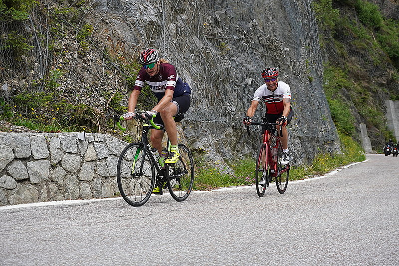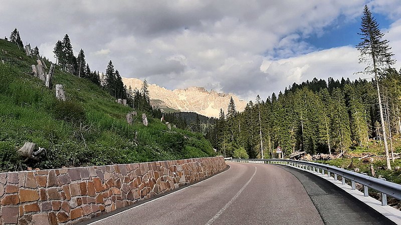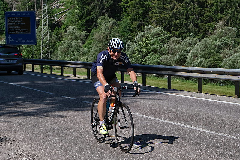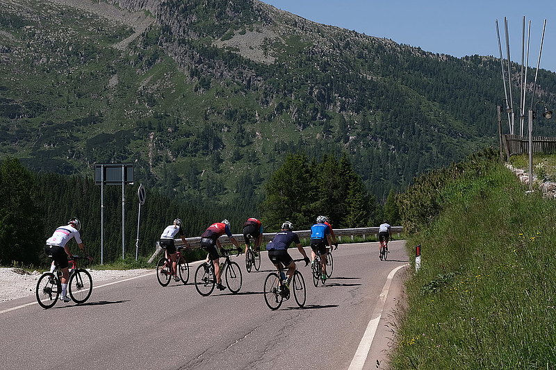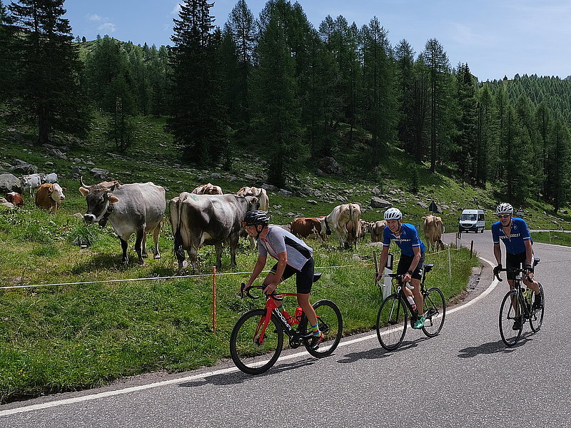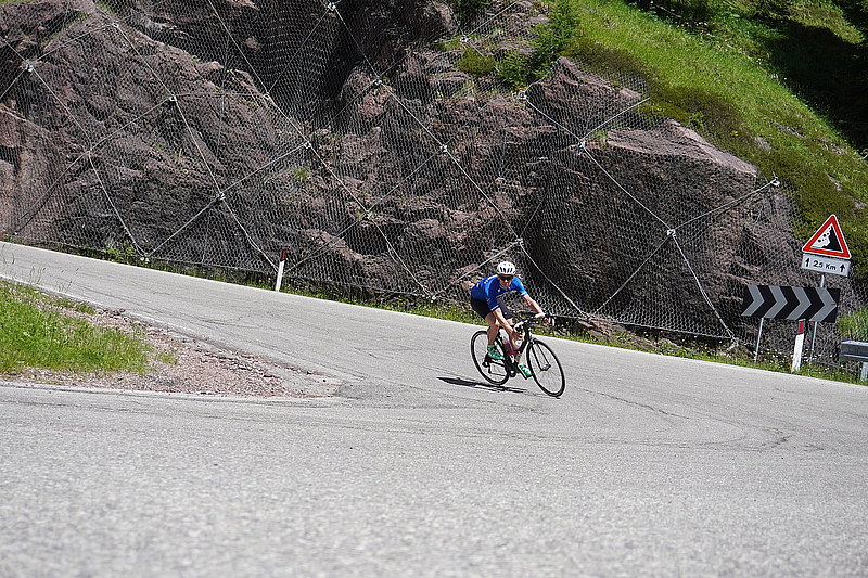 Am dritten Tag ging es über insgesamt vier Pässe, drei davon sollten die 2.000 m Grenze überschreiten. Der Passo Rolle war der erste, gefolgt vom Passo di Valles und dem Passo di Feddaia auf dessen Teer noch deutlich sichtbar war, dass erst vor kurzem der Giro d´Italia hier drüber ging. Als letzter war der Passo di Pordoi u bezwingen den ich im Rahmen des Maratona dles Dolomites schon mehrfach anders herum befahren bin.